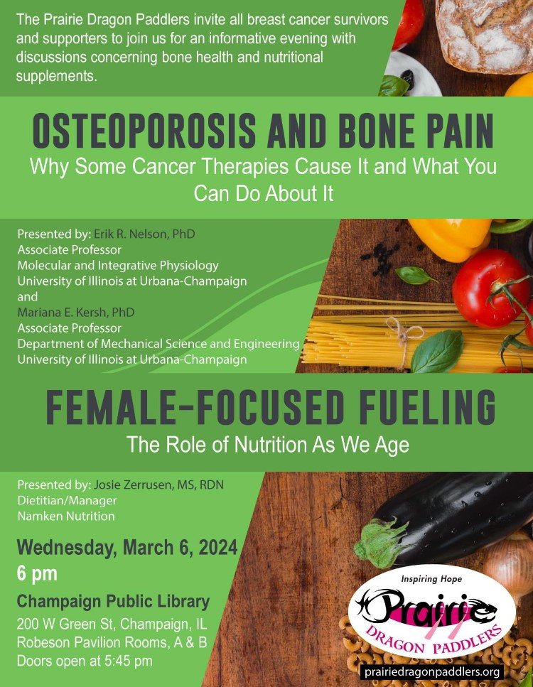 Prairie Dragon Paddlers is sponsoring a free wellness talk starting at 6 p.m., March 6, at the Champaign Public Library for all breast cancer survivors and supporters in the local area. This event features experts from the University of Illinois and the wellness community addressing issues concerning bone health and nutritional supplements.